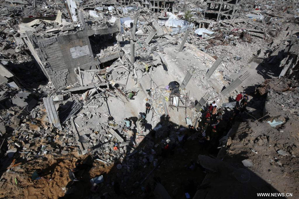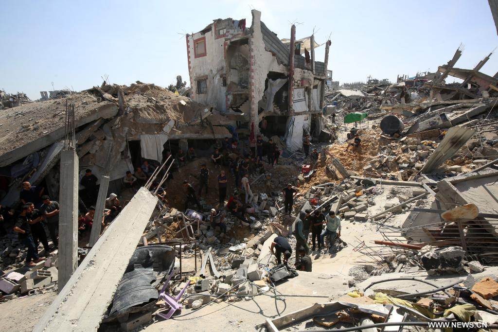 غزة 16 مايو 2025 (شينخوا) في الصورة الملتقطة يوم 16 مايو 2025، فلسطينيون يتفقدون مباني مدمرة عقب غارة جوية إسرائيلية على مخيم جباليا للاجئين، شمالي قطاع غزة.