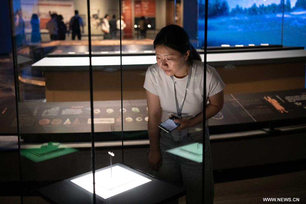 هانشان 17 مايو 2025 (شينخوا) في الصورة الملتقطة يوم 16 مايو 2025، زائرة تشهد المعروضات في متحف موقع لينغجياتان في محافظة هانشان التابعة لمدينة مآنشان بمقاطعة آنهوي بشرقي الصين.