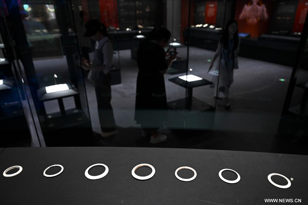 هانشان 17 مايو 2025 (شينخوا) في الصورة الملتقطة يوم 16 مايو 2025، زوار يشاهدون المعروضات في متحف موقع لينغجياتان في محافظة هانشان التابعة لمدينة مآنشان بمقاطعة آنهوي بشرقي الصين.