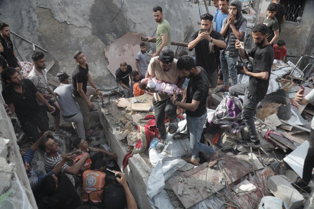 أشخاص يقومون بنقل طفل رضيع بعد غارة جوية إسرائيلية على مخيم جباليا للاجئين في شمال قطاع غزة في 18 مايو 2025.