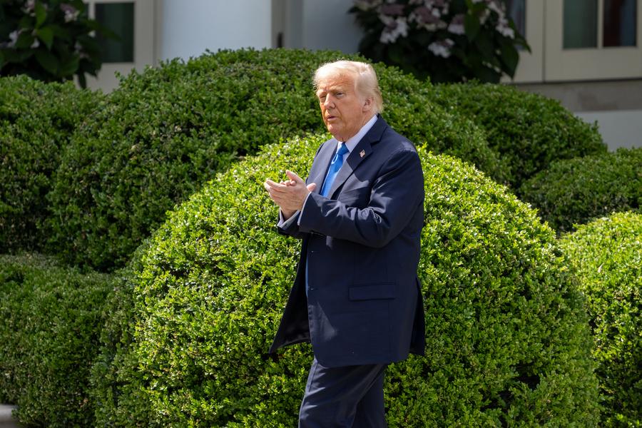 الرئيس الأمريكي دونالد ترامب أثناء مغادرته بعد مراسم توقيع قانون "تيك إت داون" في البيت الأبيض في العاصمة الأمريكية واشنطن في 19 مايو 2025. وقال الرئيس الأمريكي دونالد ترامب إن محادثته الهاتفية صباح يوم الاثنين مع نظيره الروسي فلاديمير بوتين "سارت بشكل جيد للغاية". (شينخوا)
