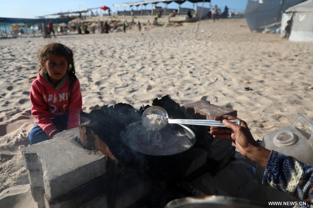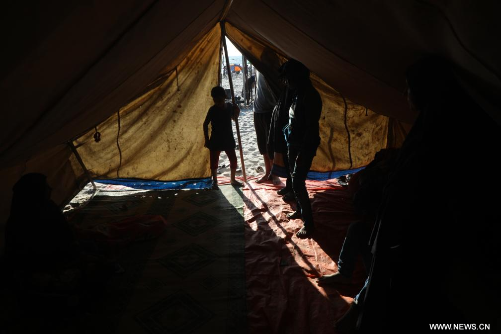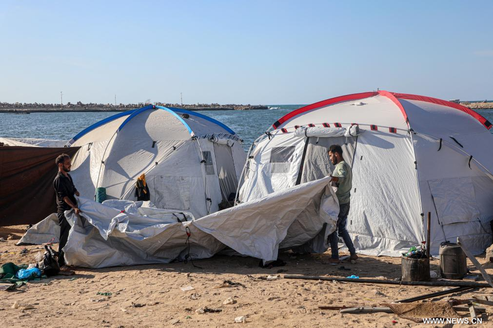 غزة 21 مايو 2025 (شينخوا) في الصورة الملتقطة يوم 21 مايو 2025، نازحون في مأوى مؤقت في منطقة الميناء البحري غربي مدينة غزة.