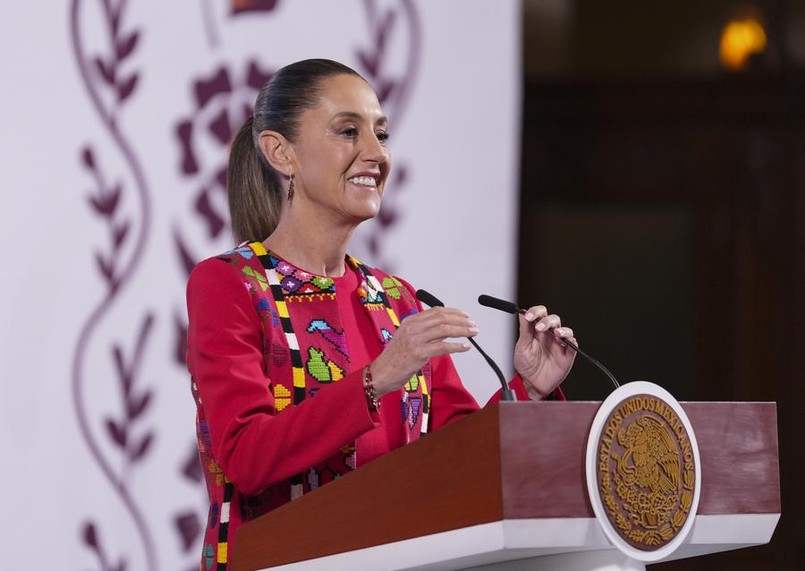 رئيسة المكسيك كلوديا شينباوم تحضر مؤتمرها الصحفي الصباحي الدوري في مكسيكو سيتي بالمكسيك، 11 أبريل 2025. (شينخوا)