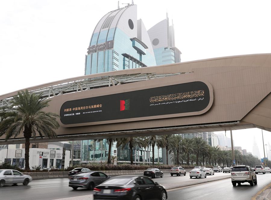 تظهر هذه الصورة شاشة عرض عن قمة الرياض الخليجية الصينية للتعاون والتنمية في أحد الشوارع بالرياض، المملكة العربية السعودية، في 7 ديسمبر 2022. (شينخوا)