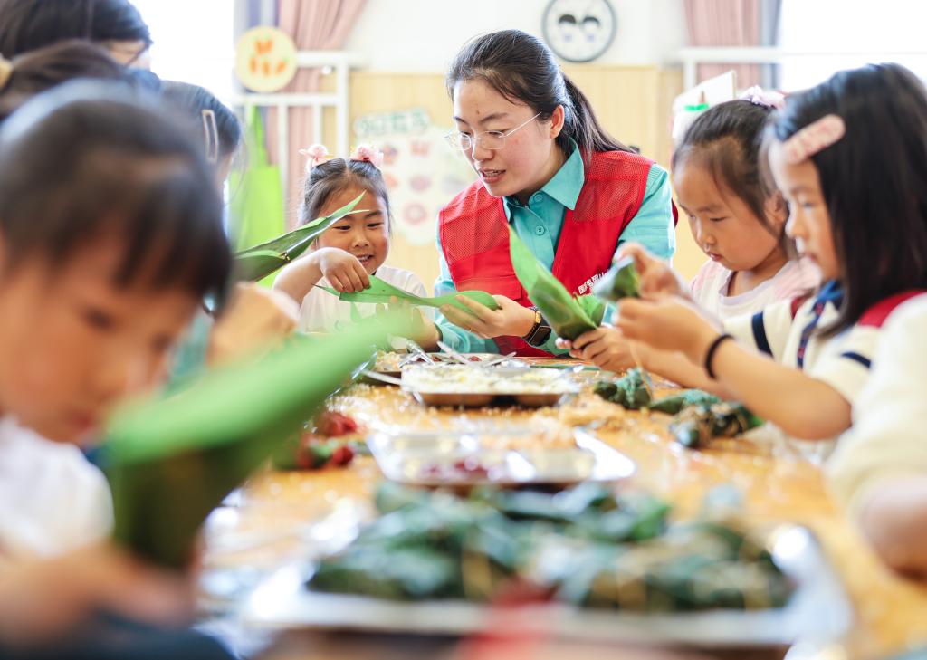 بكين 29 مايو 2025 (شينخوا) في الصورة الملتقطة يوم 28 مايو 2025، متطوعة تعلم الأطفال إعداد "تسونغ تسي" (فطائر على شكل هرم مصنوعة بالأرز الدبق الملفوفة في أوراق بامبو أو قصب) في روضة أطفال بمدينة رونغتشنغ في مقاطعة شاندونغ بشرقي الصين. ويعد مهرجان قوارب التنين المعروف أيضا باسم عيد "دوانوو"، أحد الأعياد التقليدية في الصين، الذي يوافق يوم 31 مايو من هذا العام.
