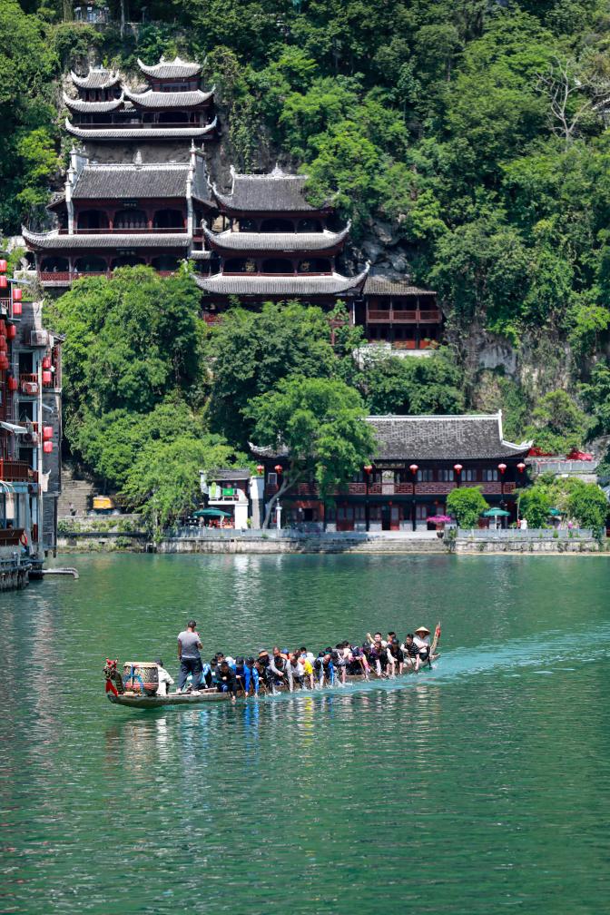 تشنيوان 29 مايو 2025 (شينخوا) في الصورة الملتقطة جوا يوم 19 مايو 2025، جانب لمجمع كهوف تشينغلونغ المبني على الجرف في بلدة تشنيوان القديمة بولاية تشياندونغنان ذاتية الحكم لقوميتي مياو ودونغ في مقاطعة قويتشو بجنوب غربي الصين. ويقع المجمع المعماري على جرف يبلغ طوله 300 متر وارتفاعه 80 مترا، وهو نموذج لتكامل السمات المعمارية بين شمالي الصين وجنوبيها.