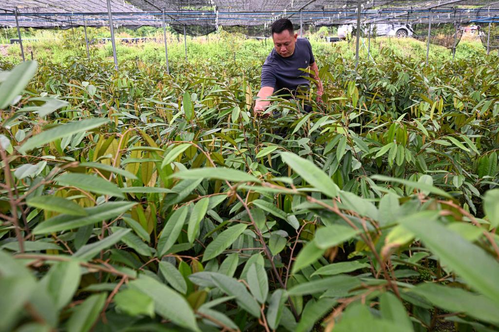 باوتينغ 28 مايو 2025 (شينخوا) في الصورة الملتقطة جوا يوم 24 مايو 2025، حديقة صناعية للدوريان في محافظة باوتينغ ذاتية الحكم لقوميتي لي ومياو في مقاطعة هاينان في جنوبي الصين.