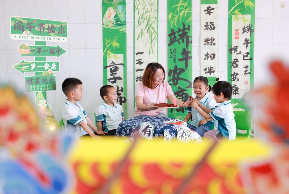 بكين 29 مايو 2025 (شينخوا) في الصورة الملتقطة يوم 28 مايو 2025، معلمة تعلم الأطفال إعداد "تسونغ تسي" (فطائر على شكل هرم مصنوعة بالأرز الدبق الملفوفة في أوراق بامبو أو قصب) في روضة أطفال بمدينة لياوتشنغ في مقاطعة شاندونغ بشرقي الصين. ويعد مهرجان قوارب التنين المعروف أيضا باسم عيد "دوانوو"، أحد الأعياد التقليدية في الصين، الذي يوافق يوم 31 مايو من هذا العام.