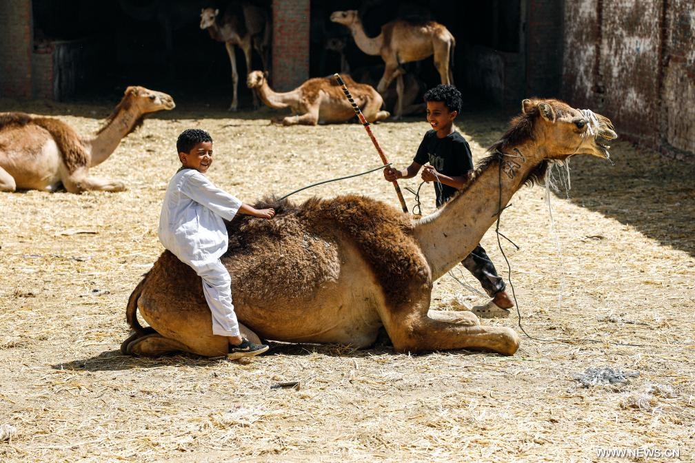الجيزة، مصر 31 مايو 2025 (شينخوا) في الصورة الملتقطة يوم 23 مايو 2025، صبيان يلعبان مع أحد الجِمال المعروضة للبيع بسوق برقاش للإبل في محافظة الجيزة بمصر.