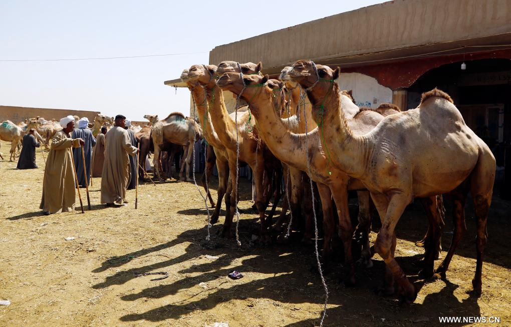 الجيزة، مصر 31 مايو 2025 (شينخوا) في الصورة الملتقطة يوم 23 مايو 2025، إبل معروضة للبيع في سوق برقاش للإبل في محافظة الجيزة بمصر.