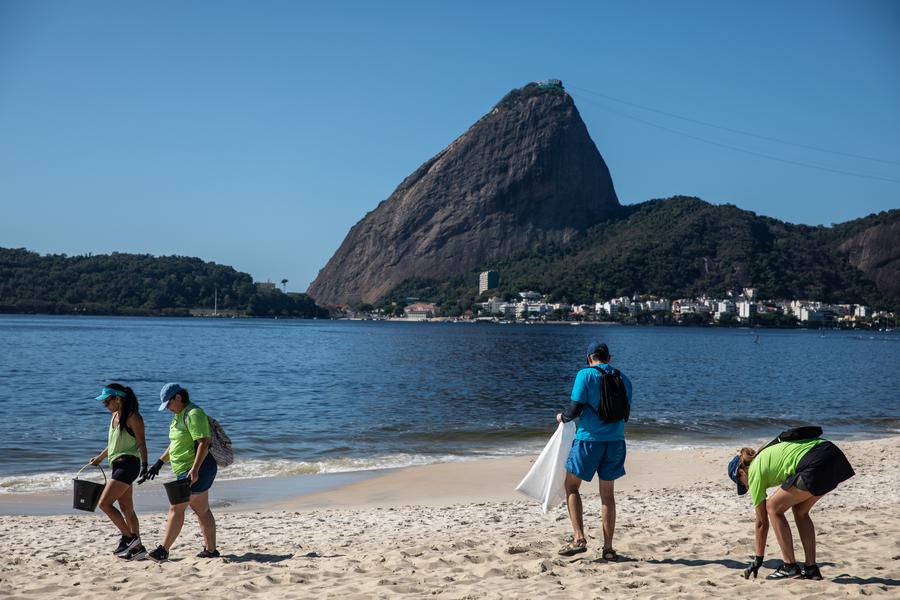 متطوعون يشاركون في جمع النفايات خلال حملة لتنظيف الشواطئ وذلك على شاطئ فلامنغو في ريو دي جانيرو، البرازيل، 22 مارس 2025. بمناسبة حلول اليوم العالمي للمياه، الذي يصادف 22 مارس من كل عام، أطلقت عدة مدن في ولاية ريو دي جانيرو البرازيلية حملات واسعة النطاق لتنظيف الشواطئ، حيث تعاون مئات المتطوعين لإزالة المخلفات البحرية، بهدف رفعة الوعي العام بأهمية الحفاظ على المحيطات وتحقيق التنمية المستدامة. (شينخوا)
