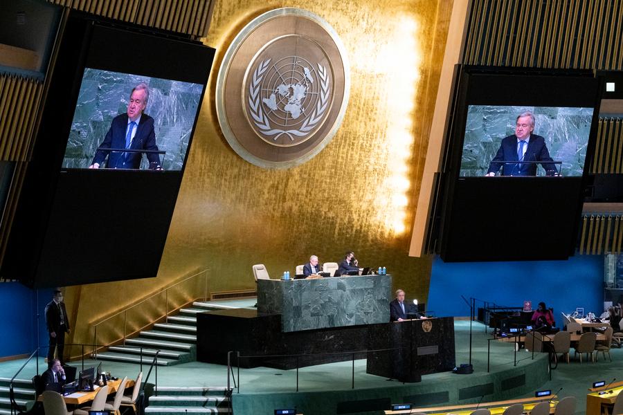 الأمين العام للأمم المتحدة أنطونيو غوتيريش (واقفا على المنصة وظاهرا على الشاشات) يلقي كلمة في اجتماع للجمعية العامة أقيم لإحياء الذكرى الـ40 لاعتماد اتفاقية الأمم المتحدة لقانون البحار وفتح باب التوقيع عليها، في مقر الأمم المتحدة بنيويورك، في 8 ديسمبر 2022. (الصورة بعدسة إسكيندر ديبيبي/الأمم المتحدة/ نُشرت عبر شينخوا)
