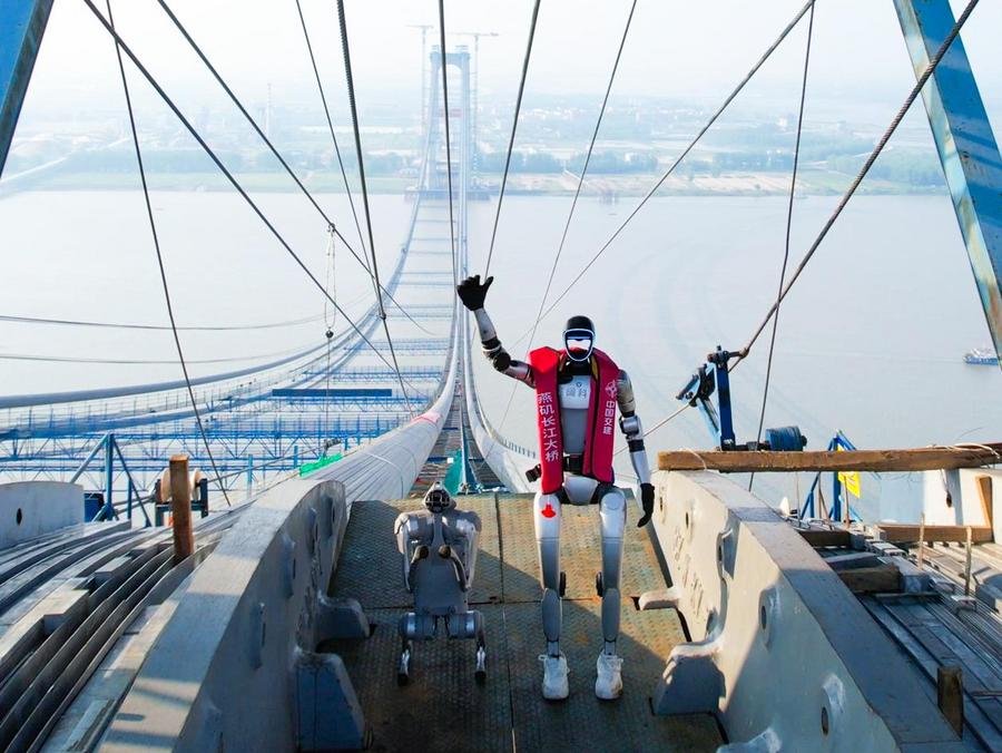 بكين 11 يونيو 2025 (شينخوا) تسلق روبوت بشري وكلب روبوت مؤخرا جسر يانجي على نهر اليانغتسي بوسط الصين، ليشاركا في تحدي المشي على أطول "طريق قطط" في العالم.