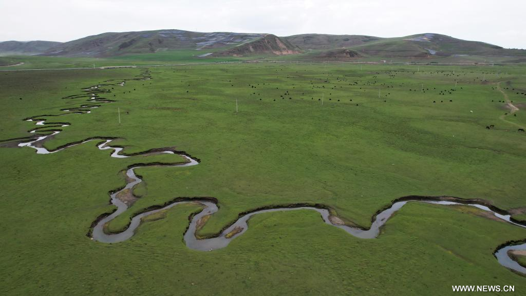 مينشيان 11 يونيو 2025 (شينخوا) في الصورة الملتقطة جوا يوم 10 يونيو 2025 مناظر المراعي في أراضي لانغدو الرطبة في محافظة مينشيان بمقاطعة قانسو في شمال غربي الصين.