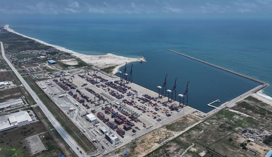 تُظهر هذه الصورة الجوية الملتقطة بطائرة بدون طيار في الأول من مارس 2024 منظرا لميناء ليكي في لاغوس، نيجيريا. (شينخوا)