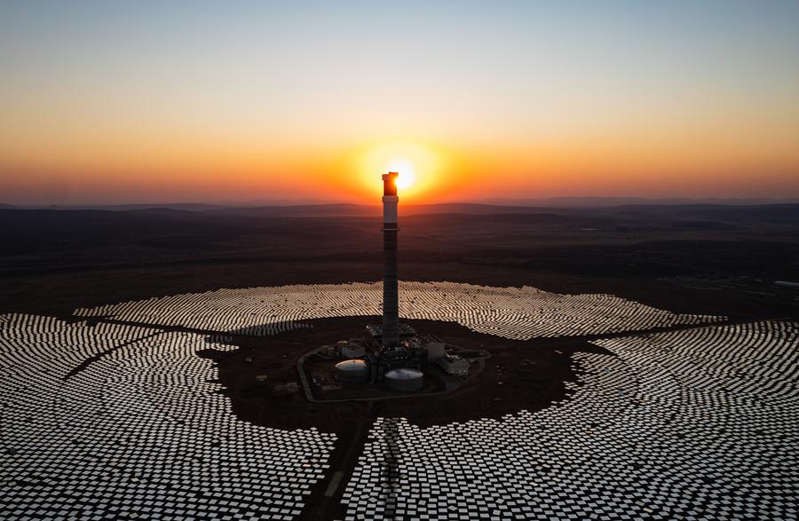 تُظهر هذه الصورة الجوية الملتقطة بطائرة بدون طيار في 20 أغسطس 2024 منظرا لمشروع ريدستون للطاقة الشمسية الحرارية المركزة بالقرب من بوستماسبرغ في مقاطعة كيب الشمالية بجنوب أفريقيا. (شينخوا)