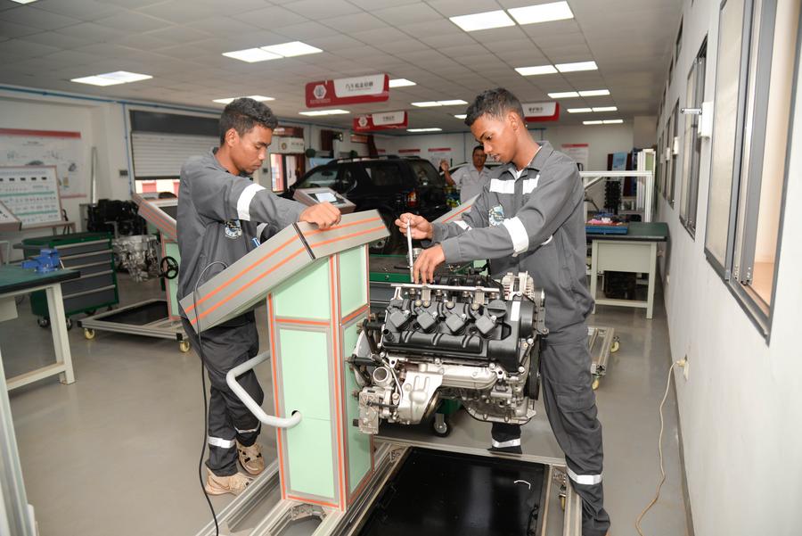 طالبان في تخصص صيانة السيارات يحضران جلسة تدريب عملي في ورشة عمل لوبان في أنتاناناريفو، مدغشقر، 10 فبراير 2025. (شينخوا)