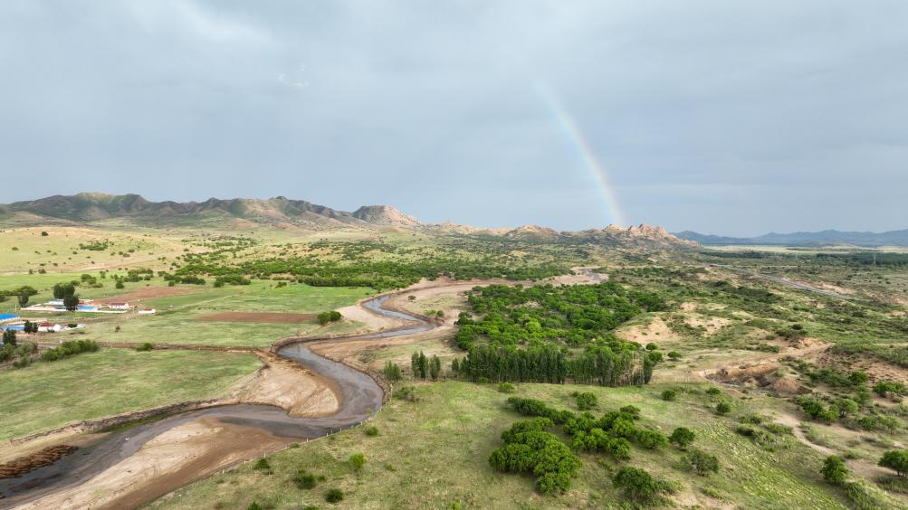 تشيفنغ 15 يونيو 2025 (شينخوا) في الصورة الملتقطة جوا يوم 12 يونيو 2025، مشهد للمناظر الصيفية الطبيعية الجميلة في مروج هورتشين بمدينة تشيفنغ بمنطقة منغوليا الداخلية ذاتية الحكم في شمالي الصين.
