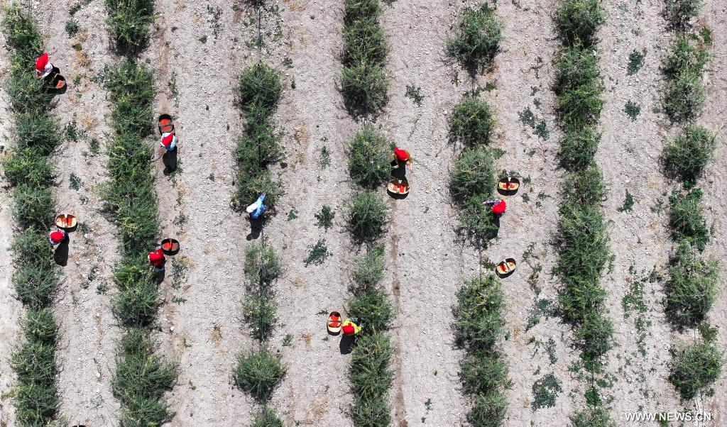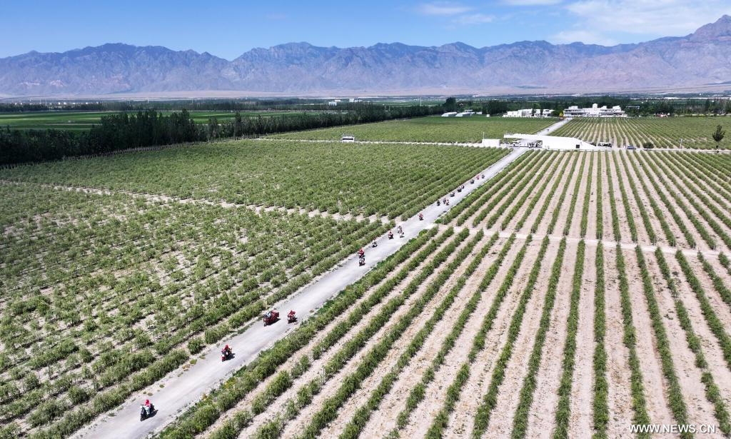 يينتشوان 16 يونيو 2025 (شينخوا) في الصورة الملتقطة يوم 15 يونيو 2025، منظر لمزارعين يشتغلون في مزرعة بايروييوان لتوت غوجي في منطقة نينغشيا ذاتية الحكم لقومية هوي في شمال غربي الصين، حيث استقبلت المزرعة مؤخرا حصادا وفيرا لثمار توت غوجي.
