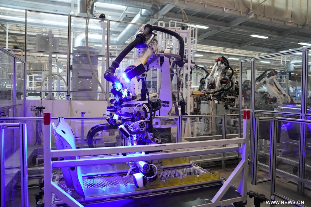 بكين 18 يونيو 2025 (شينخوا) في الصورة الملتقطة يوم 16 يونيو 2025، روبوتات تعمل في مصنع سيارات لشركة "شياومي" الصينية العملاقة في منطقة التنمية الاقتصادية والتكنولوجية في بكين، حيث يمتد المصنع على مساحة تزيد عن 700 ألف متر مربع.