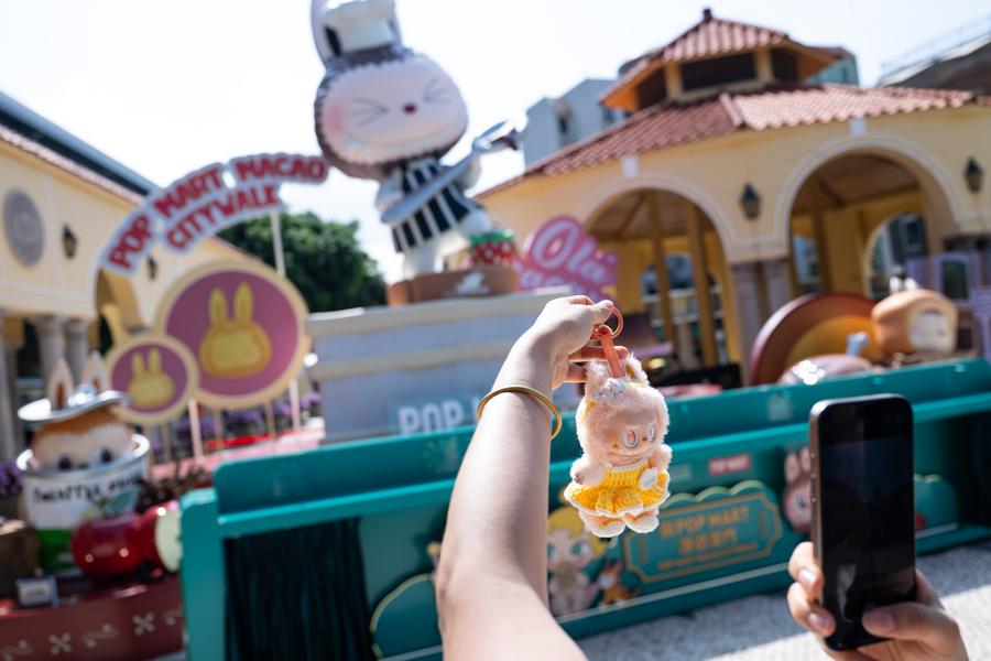 زائرة تلتقط صورا لدمية "لابوبو" في معرض تايبا ضمن فعالية "بوب مارت ماكاو سيتي ووك" بماكاو الصينية، في 6 يونيو 2025. (شينخوا)