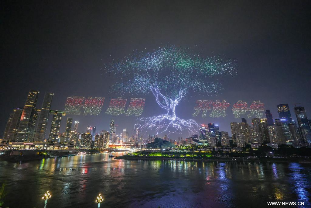 تشونغتشينغ 19 يونيو 2025 (شينخوا) في الصورة الملتقطة يوم 17 يونيو 2025، مشهد من عرض ضوئي بطائرات دون طيار في بلدية تشونغتشينغ بجنوب غربي الصين.