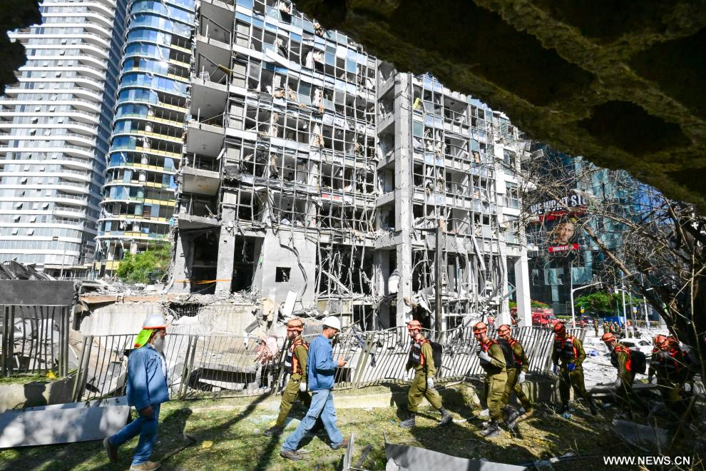 رامات جان 19 يونيو 2025 (شينخوا) في الصورة الملتقطة يوم 19 يونيو 2025، مشهد لمباني متضررة في موقع سقوط صاروخ أُطلق من إيران وألحق أضرارا بالغة بمدينة رامات جان، في إسرائيل. ذكرت وكالة الأنباء الإيرانية الرسمية ((إرنا)) أن إيران استهدفت منشآت استخبارات عسكرية إسرائيلية في ضرباتها على جنوبي البلاد صباح اليوم (الخميس)، وليس مستشفى كما أفادت بعض وسائل الإعلام.