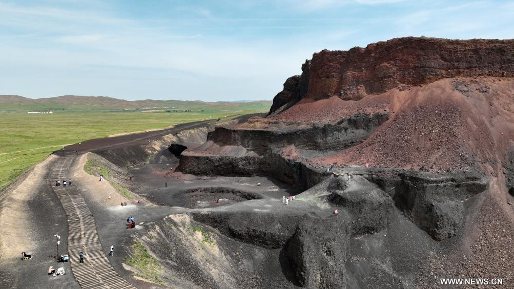 وولانتشاب 18 يونيو 2025 (شينخوا) في الصورة الملتقطة يوم 17 يونيو 2025، سياح يزورون مجموعة براكين وولانهادا في جناح تشاهار الأيمن في مدينة وولانتشاب بمنطقة منغوليا الداخلية ذاتية الحكم بشمالي الصين. وتتميز مجموعة براكين وولانهادا بمناظر جيولوجية خاصة مثل البراكين والحمم البركانية. ومع حلول فصل الصيف، تدخل هذه المجموعة ذروة الموسم السياحي.