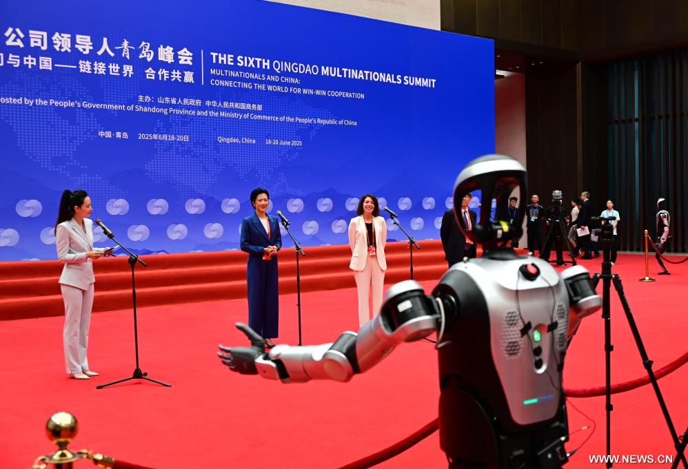 تشينغداو 20 يونيو 2025 (شينخوا) في الصورة الملتقطة يوم 19 يونيو 2025، روبوت بشري يطرح أسئلة خلال قمة تشينغداو السادسة للشركات متعددة الجنسيات في مدينة تشينغداو الساحلية بمقاطعة شاندونغ بشرقي الصين.