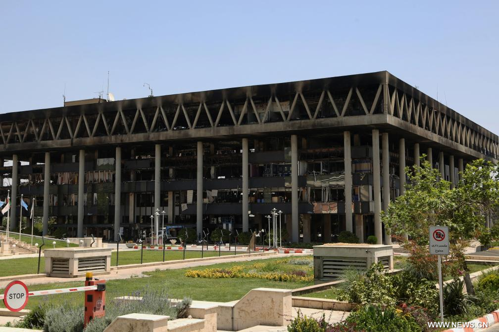 طهران 23 يونيو 2025 (شينخوا) في الصورة الملتقطة يوم 19 يونيو 2025، مشهد عقب الهجوم على مبنى لهيئة الإذاعة والتليفزيون الإيرانية في العاصمة الإيرانية طهران.