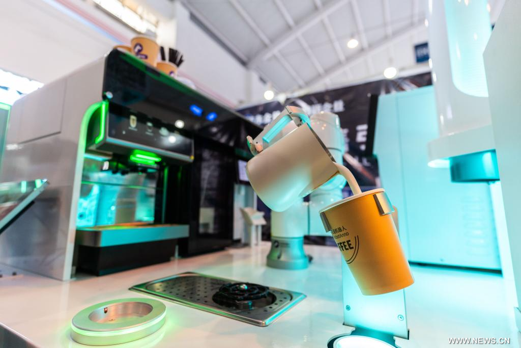 كونمينغ 23 يونيو 2025 (شينخوا) في الصورة الملتقطة يوم 22 يونيو 2025، روبوت يعد القهوة خلال الدورة التاسعة من معرض الصين-جنوب آسيا في مدينة كونمينغ، حاضرة مقاطعة يوننان بجنوب غربي الصين.