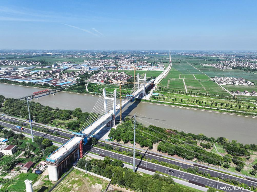 نانجينغ 3 يوليو 2025 (شينخوا) في الصورة الملتقطة يوم أول يوليو 2025، جانب من جسر معلق بالكابلات عبر نهر يينجيانغ في مقاطعة جيانغسو بشرقي الصين. واكتملت أعمال ربط الجسر، الذي يبلغ طوله 522.3 متر، بنجاح يوم الثلاثاء الماضي.