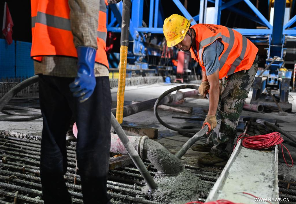 نانجينغ 3 يوليو 2025 (شينخوا) في الصورة الملتقطة يوم 30 يونيو 2025، عمال في موقع بناء جسر معلق بالكابلات عبر نهر يينجيانغ في مقاطعة جيانغسو بشرقي الصين. واكتملت أعمال ربط الجسر، الذي يبلغ طوله 522.3 متر، بنجاح يوم الثلاثاء الماضي.