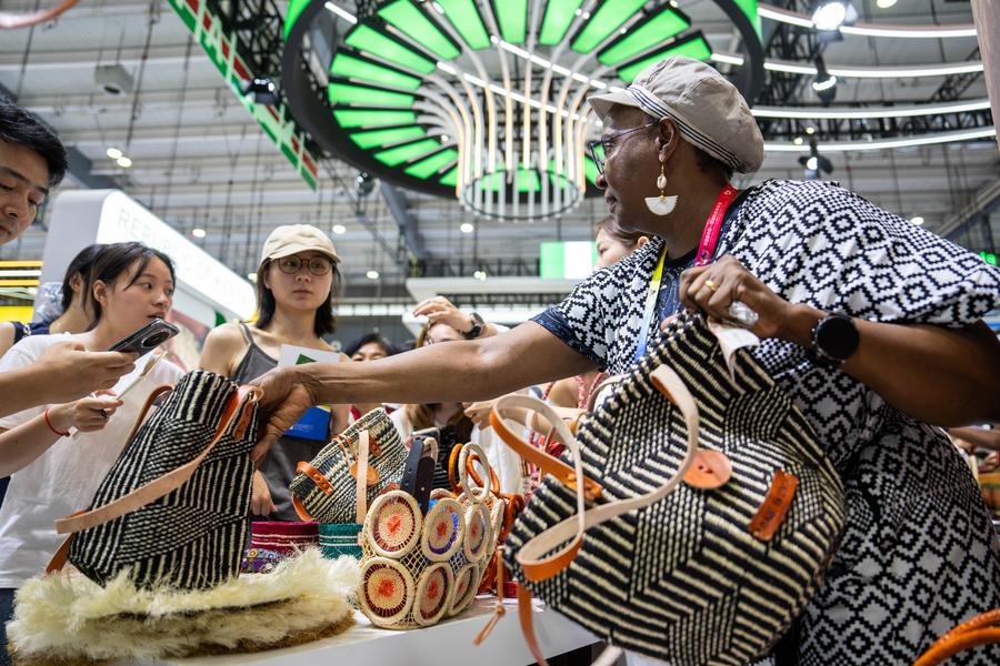 إحدى العارضات (على اليمين) تعرّف الزوار على منتجات أفريقية خلال المعرض الاقتصادي والتجاري الصيني-الأفريقي في دورته الرابعة في مركز تشانغشا الدولي للمؤتمرات والمعارض في تشانغشا بمقاطعة هونان بوسط الصين، 13 يونيو 2025. (شينخوا)