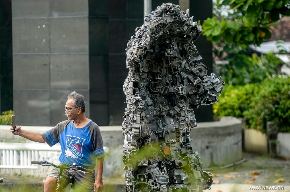 يوجياكارتا 7 يوليو 2025 (شينخوا) في الصورة الملتقطة يوم 6 يوليو 2025، طفل يمر بجوار مجسم فني ضمن فعاليات مهرجان الفن الإبداعي في مدينة يوجياكارتا بإندونيسيا.