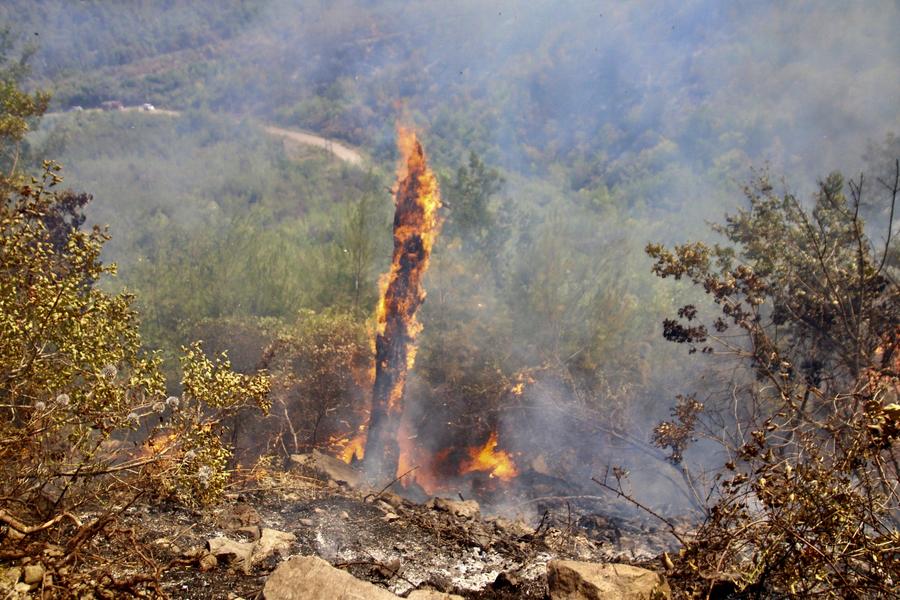 شجرة تحترق وسط دخان كثيف خلال حريق غابة في ريف محافظة اللاذقية السورية، في7 يوليو 2025.(شينخوا)