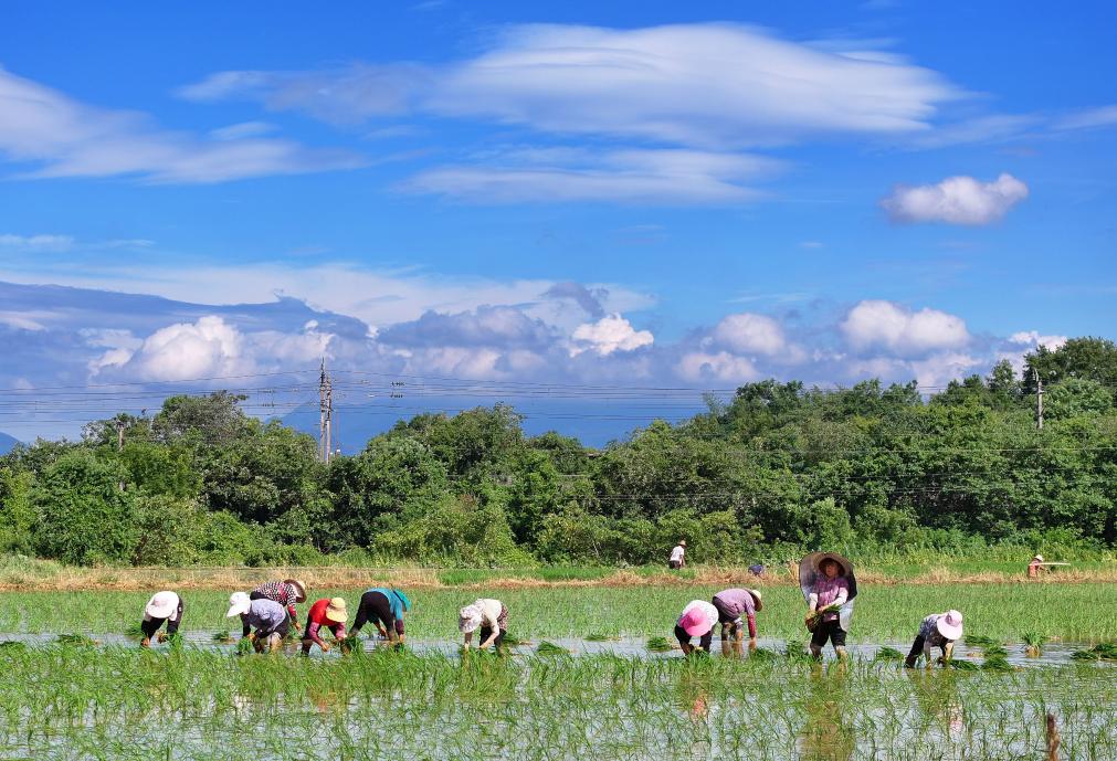 بكين 22 يوليو 2025 (شينخوا) في الصورة الملتقطة يوم 21 يوليو 2025، قرويون يزرعون شتلات الأرز في مدينة هنغيانغ بمقاطعة هونان في وسط الصين.