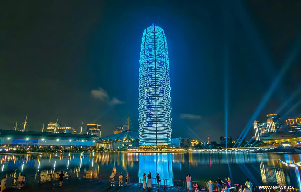 تشنغتشو 25 يوليو 2025 (شينخوا) في الصورة الملتقطة يوم 23 يوليو 2025، مبنى مضاء بالقرب من مركز تشنغتشو الدولي للمؤتمرات والمعارض في تشنغتشو حاضرة مقاطعة خنان بوسط الصين، وهو موقع انعقاد قمة وسائل الإعلام ومراكز الفكر لمنظمة شانغهاي للتعاون. وتعقد القمة، المقامة تحت عنوان "التمسك بروح شانغهاي لبناء موطن أكثر جمالا" خلال الفترة من 23 إلى 27 يوليو الجاري.