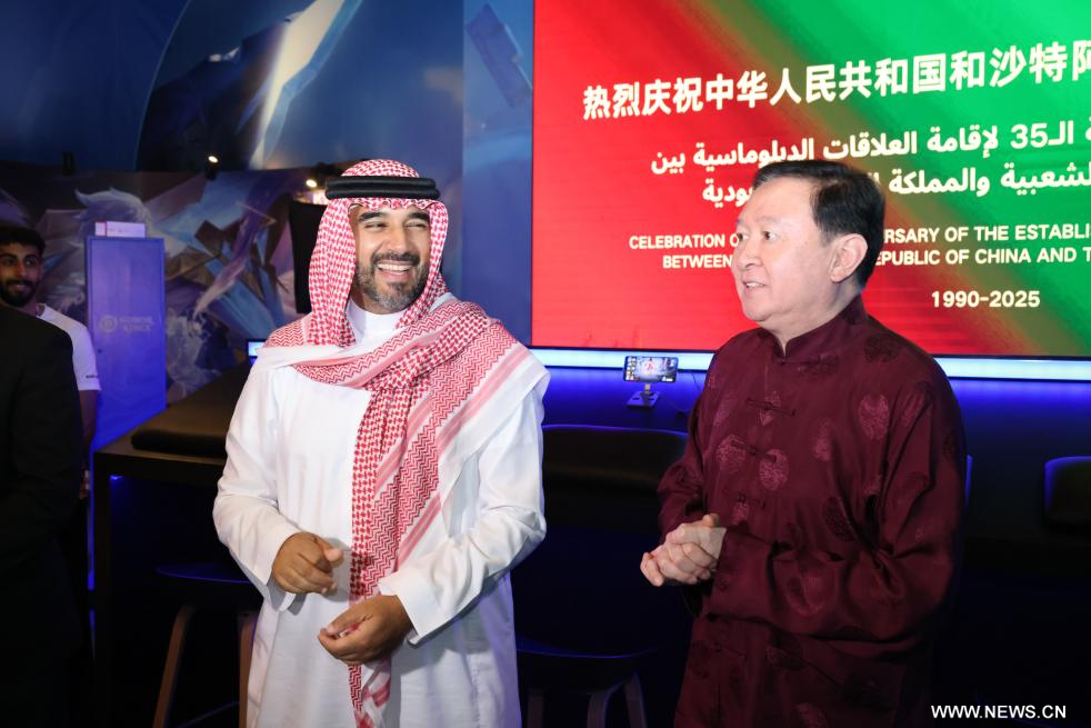 في الصورة الملتقطة يوم 26 يوليو 2025، الأمير فيصل بن بندر بن سلطان آل سعود (يسار الصورة)، رئيس الاتحاد السعودي للرياضات الإلكترونية؛ والسفير الصيني لدى المملكة العربية السعودية تشانغ هوا، يتحدثان داخل جناح الثقافة للرياضات الإلكترونية الصينية والسعودية، وذلك خلال فعاليات كأس العالم للرياضات الإلكترونية 2025 في الرياض بالمملكة العربية السعودية.