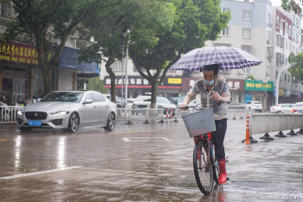 في الصورة الملتقطة يوم 29 يوليو 2025، امرأة تركب دراجة هوائية وسط أمطار غزيرة في محافظة شيانغشان بمدينة نينغبوه في مقاطعة تشجيانغ بشرقي الصين.