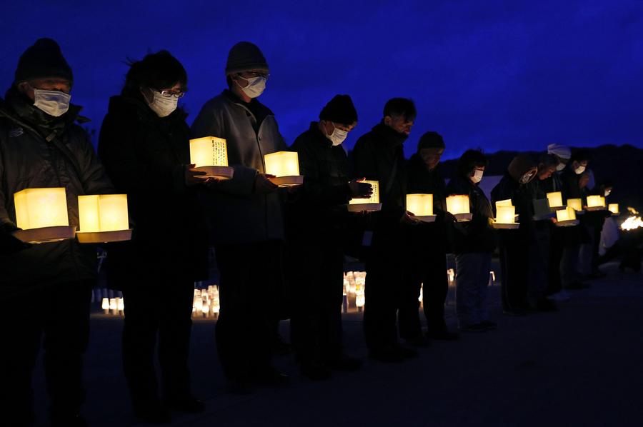 أناس ينعون ضحايا زلزال وتسونامي 2011 في إيواتي، اليابان، في 11 مارس 2020. (وكالة كيودو للأنباء/نشر عبر شينخوا)