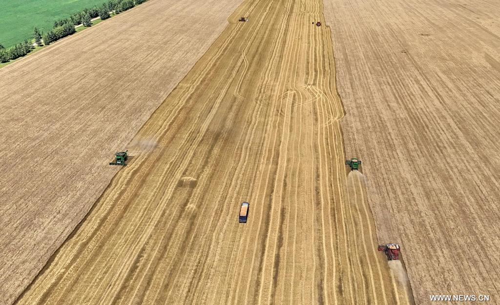 هاربين 6 أغسطس 2025 (شينخوانت) في الصورة الملتقطة جوا يوم 5 أغسطس 2025، مشهد حصاد القمح في حقول مدينة هيخه بمقاطعة هيلونغجيانغ شمال شرقي الصين. شهدت مقاطعة هيلونغجيانغ، التي تعتبر إحدى المناطق الرئيسية لإنتاج الحبوب في الصين والمعروفة باسم "مخزن الحبوب" في البلاد، دخول محاصيلها مرحلة النضج.