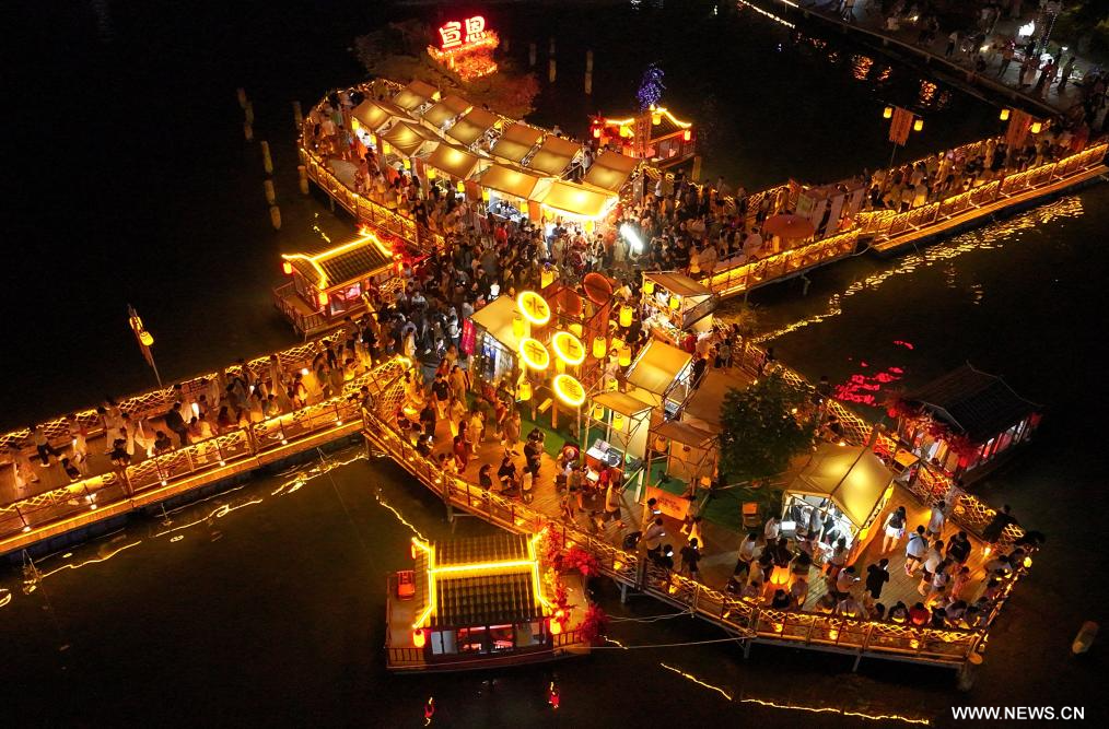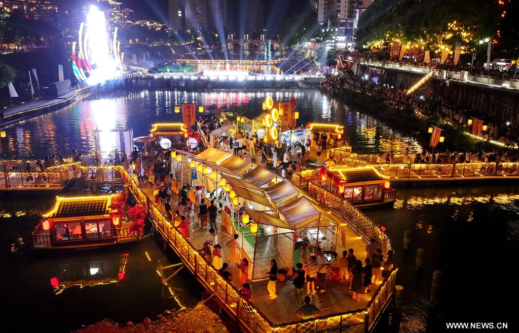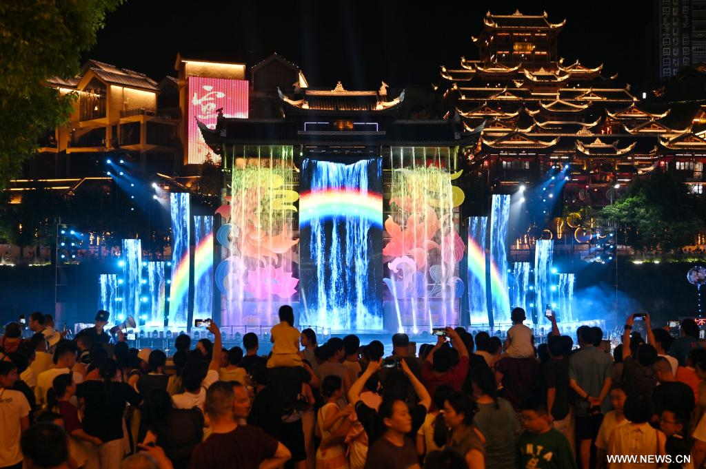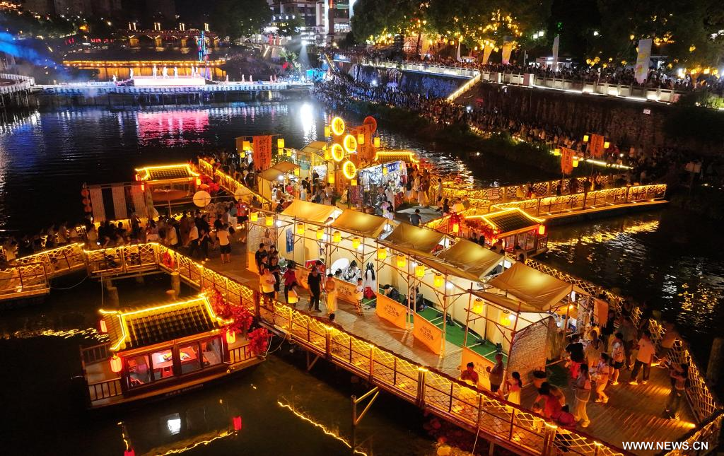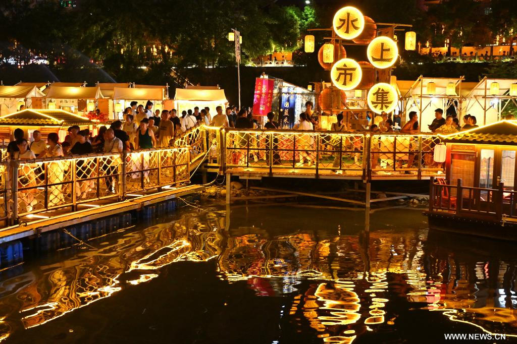 أنشي 11 أغسطس 2025 (شينخوا) في الصورة الملتقطة يوم 9 أغسطس 2025، أناس يزورون سوقا على نهر قونغشوي في ولاية أنشي ذاتية الحكم لقوميتي توجيا ومياو بمقاطعة هوبي في وسط الصين.