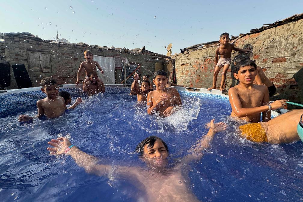 القاهرة 12 أغسطس 2025 (شينخوا) في الصورة الملتقطة يوم 12 أغسطس 2025، أطفال يستمتعون بالمياه في حمام سباحة متنقل خلال موجة حارة في القاهرة، مصر.