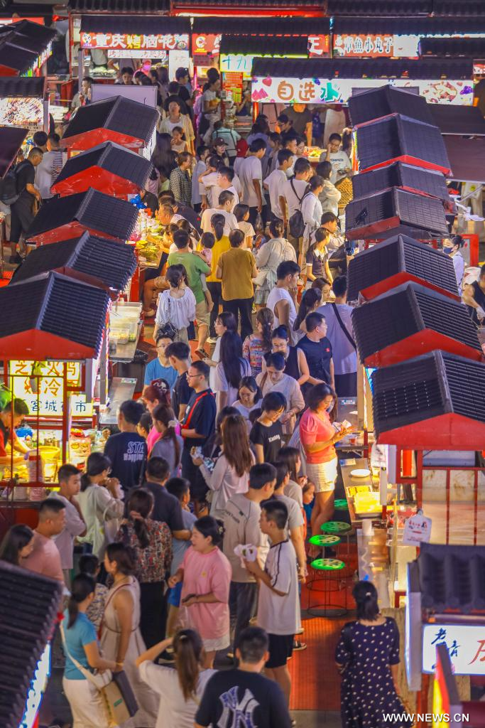 بكين 14 أغسطس 2025 (شينخوا) في الصورة الملتقطة يوم 12 أغسطس 2025، أناس يزورون سوقا ليلية في مدينة تشينغداو بمقاطعة شاندونغ في شرقي الصين.