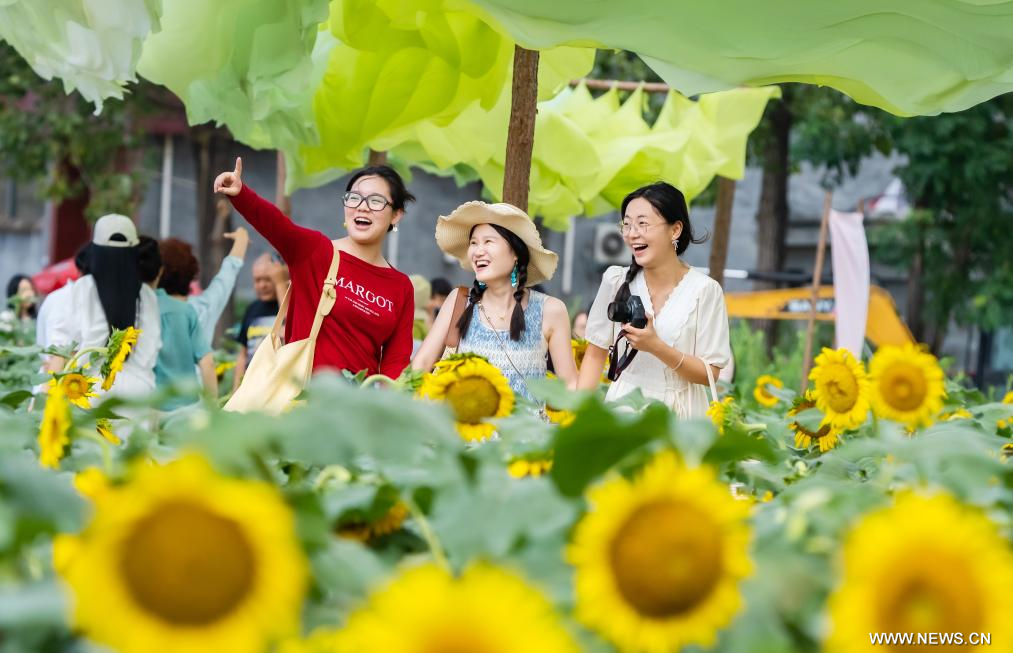بكين 14 أغسطس 2025 (شينخوا) في الصورة الملتقطة يوم 12 أغسطس 2025، سياح يزورون موقعا سياحيا في مدينة تشوماديان بمقاطعة خنان في وسط الصين.