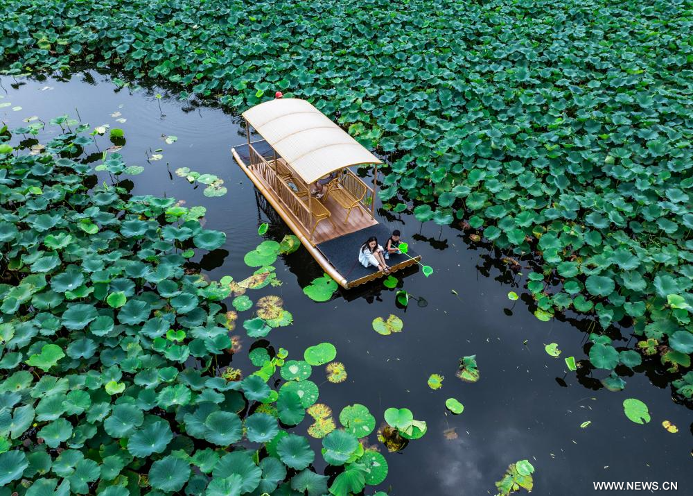 بكين 14 أغسطس 2025 (شينخوا) في الصورة الملتقطة يوم 13 أغسطس 2025، جانب من بركة لوتس في موقع سياحي بمدينة شينغهوا في مقاطعة جيانغسو بشرقي الصين.