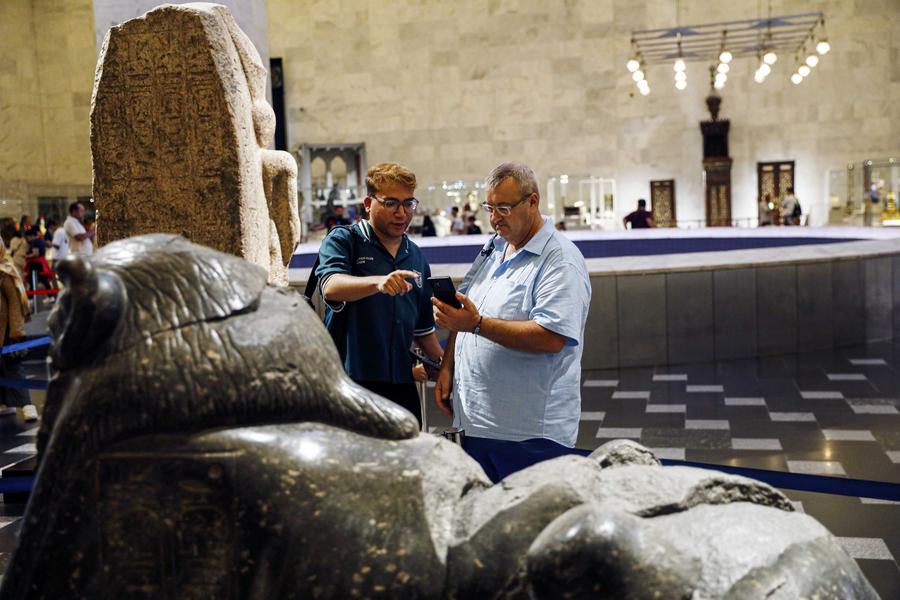 القاهرة 14 أغسطس 2025 (شينخوا) في القاعة الرئيسة ذات الإضاءة الخافتة بالمتحف القومي للحضارة المصرية، تجمع حشد صغير حول التابوت الخشبي الملون لـ"سن نجم"، رئيس العمال في الأسرة التاسعة عشرة (1295-1186 ق.م)، وبالقرب منهم رفع المطور المصري أحمد الخولي هاتفه ووجه الكاميرا نحو الرموز الهيروغليفية الرأسية المنقوشة على التابوت.