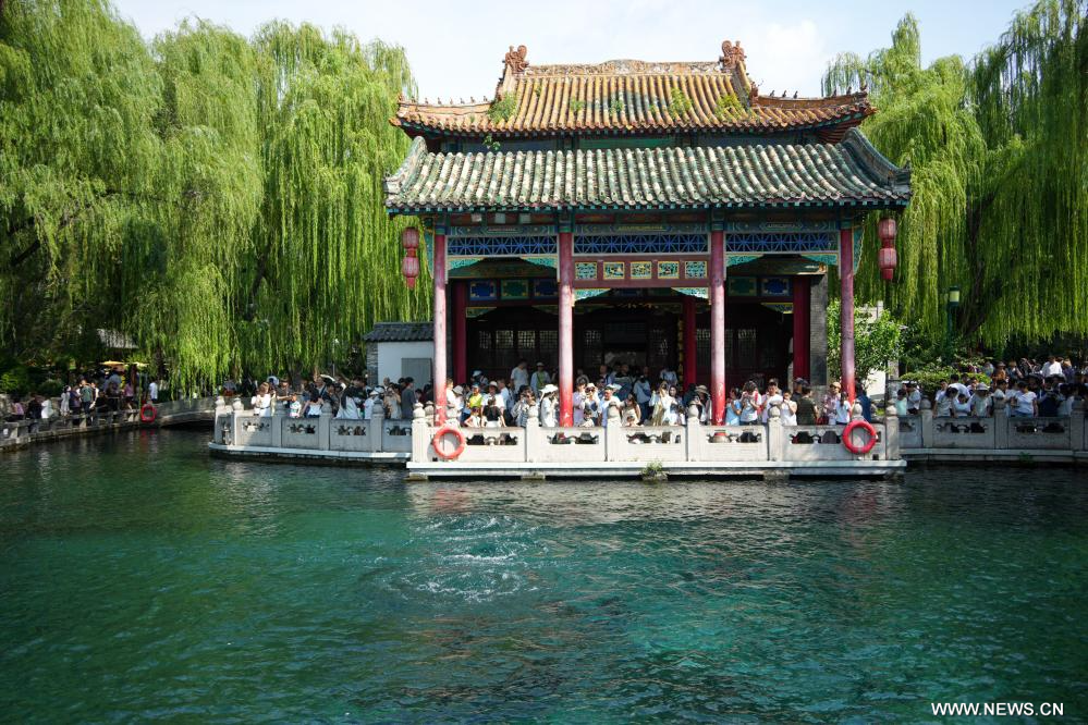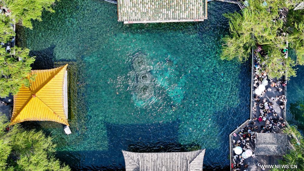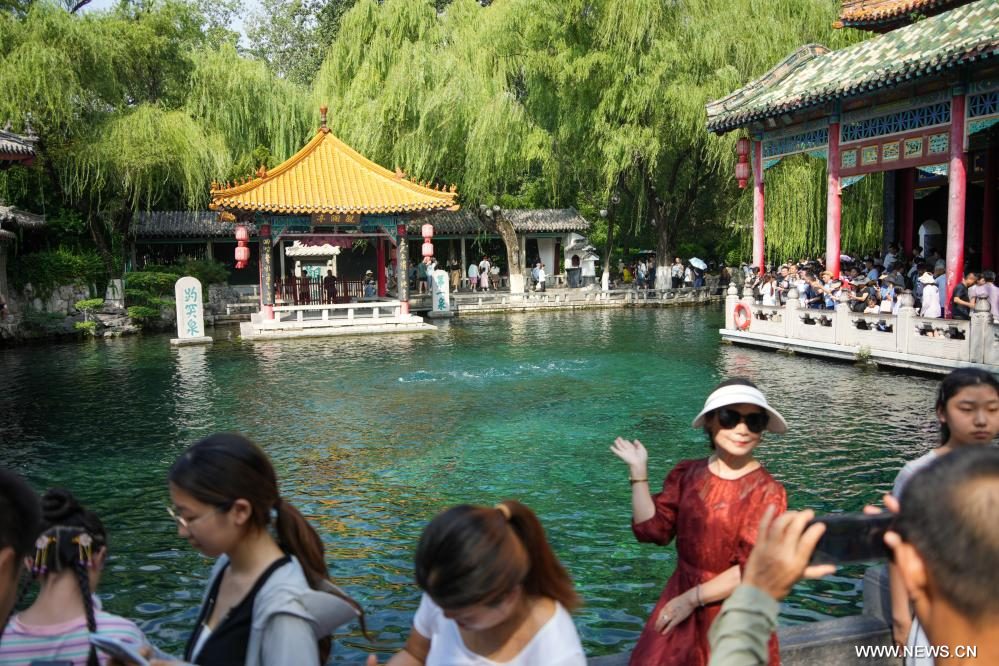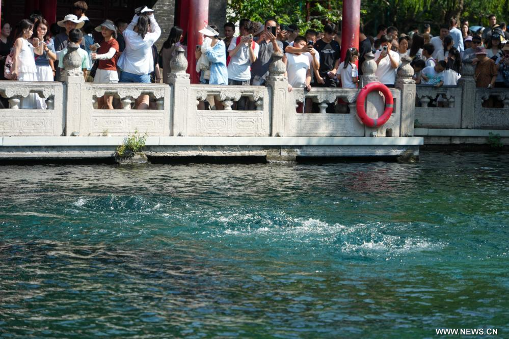 جينان 23 أغسطس 2025 (شينخوا) في الصورة الملتقطة يوم 22 أغسطس 2025، أناس يزورون ينبوع باوتو في مدينة جينان، حاضرة مقاطعة شاندونغ بشرقي الصين، المعروفة أيضا باسم "مدينة الألف ينبوع".