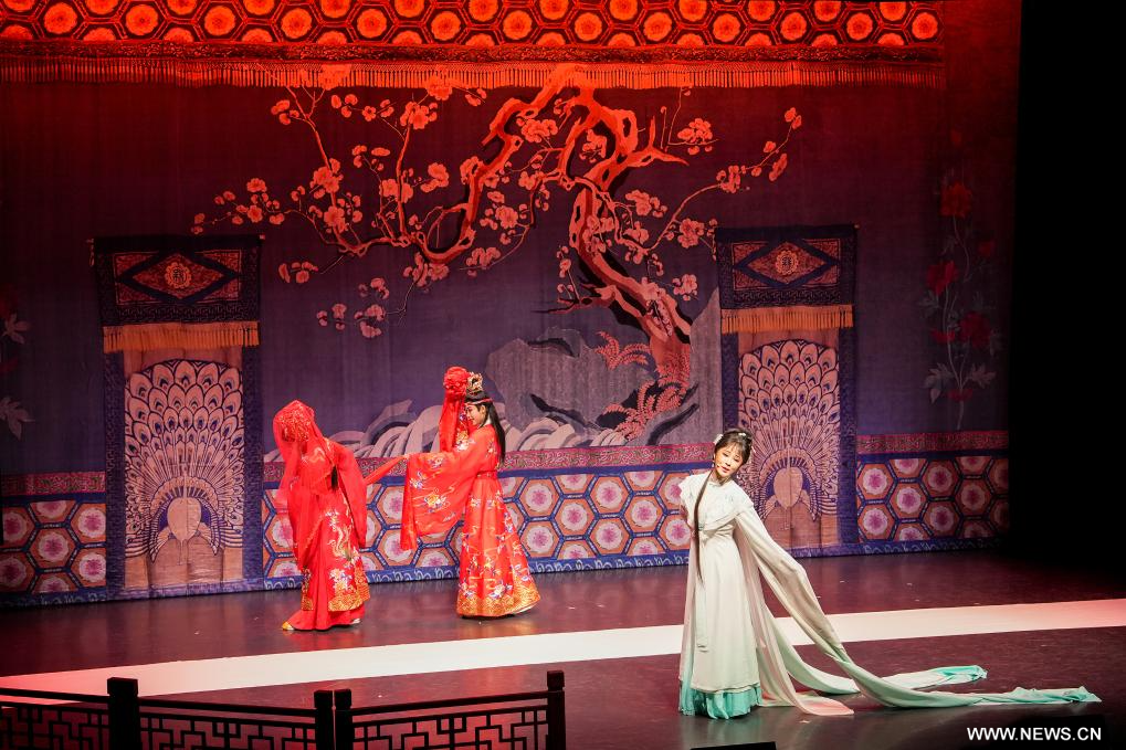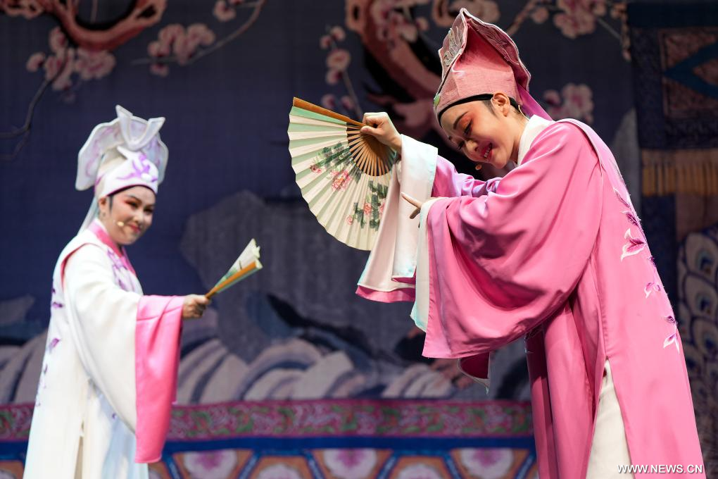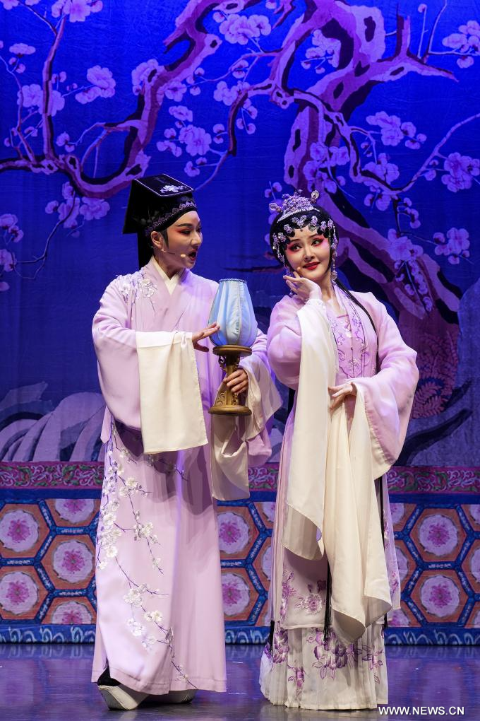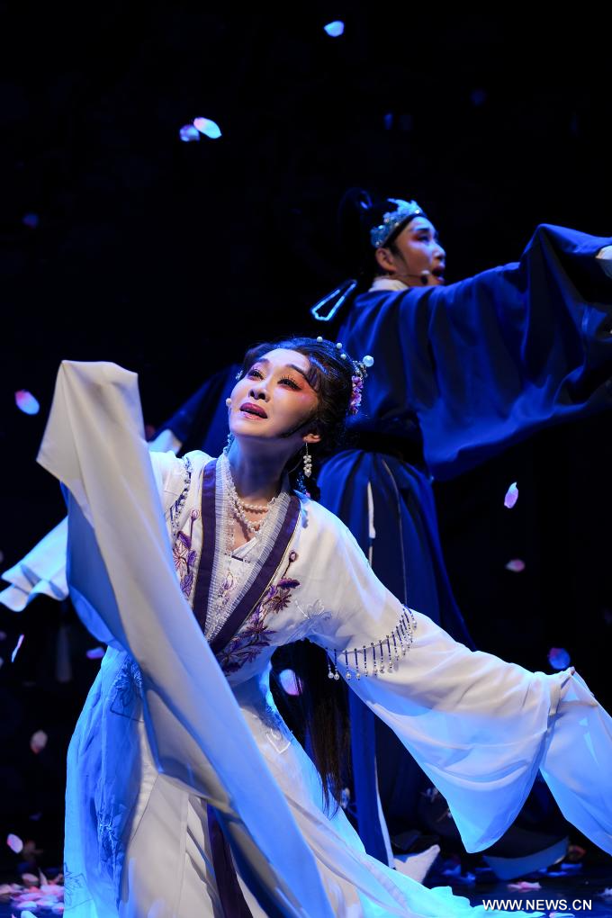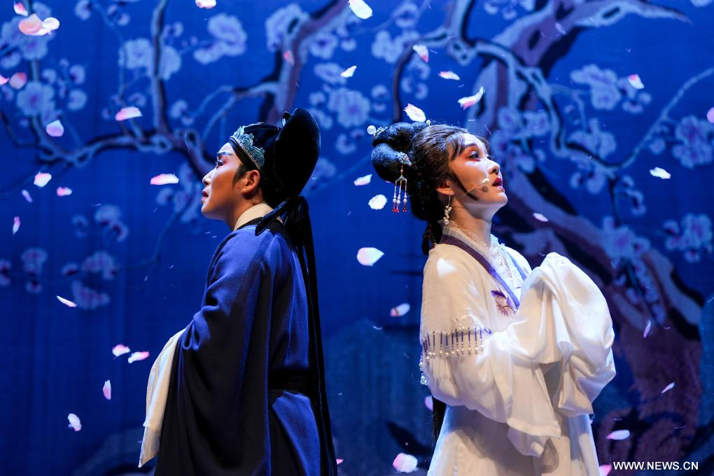 لندن 24 أغسطس 2025 (شينخوانت) في الصورة الملتقطة يوم 21 أغسطس 2025، يؤدي فنانو فرقة شياوبايهوا لأوبرا يوي من مقاطعة تشجيانغ شرقي الصين مقتطفا من المسرحية الصينية الكلاسيكية في لندن، بريطانيا. قدمت فرقة أوبرا يوي شياوبايهوا من مقاطعة تشجيانغ شرقي الصين عروضا خاصة تضم مقتطفات من المسرحيات الصينية الكلاسيكية ابتداء من يوم الخميس، مما استقطبت أكثر من 800 متفرج خلال ليلتين .